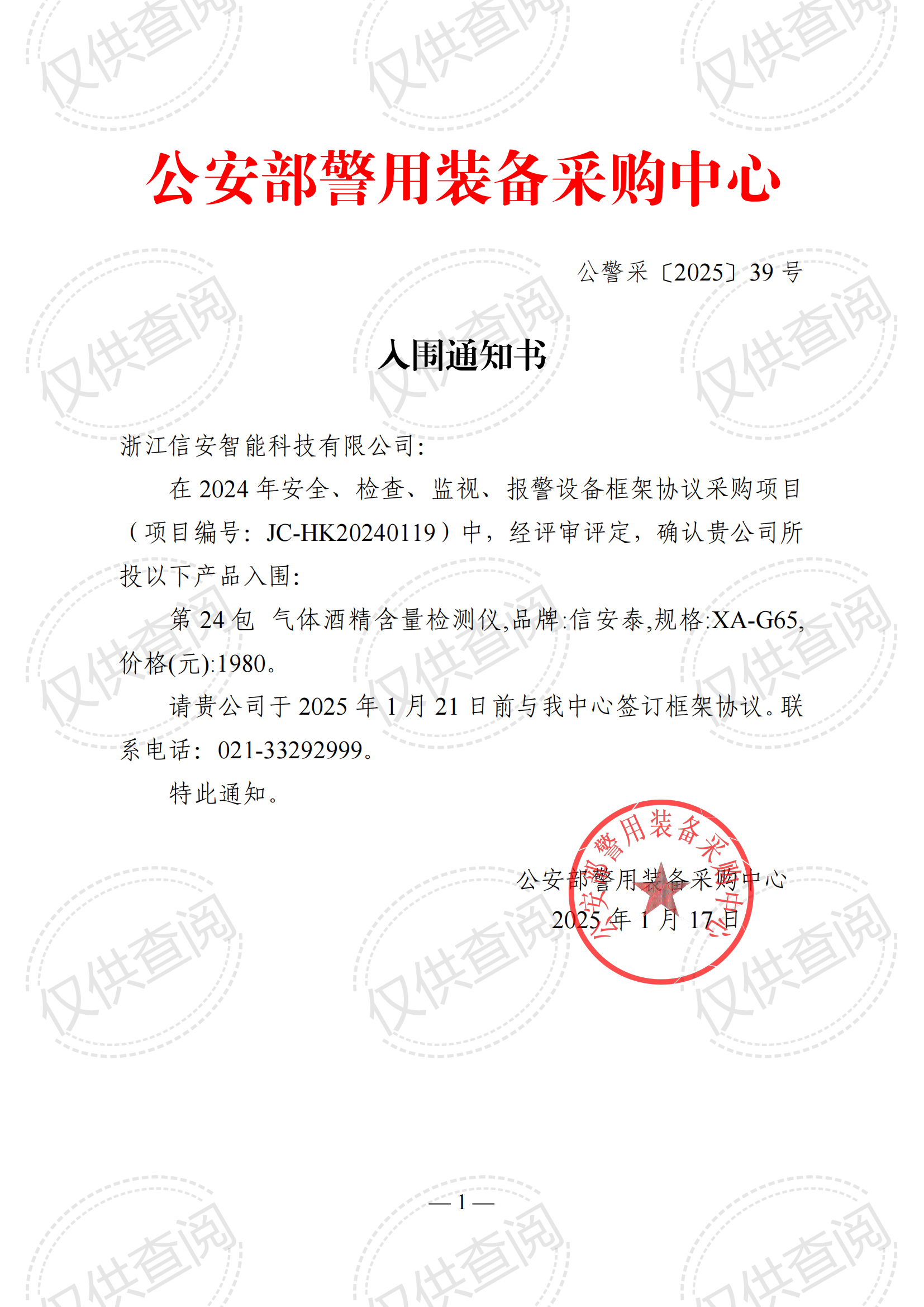 - 2025-1-22我司氣體酒精含量檢測儀成功入圍公安部警用采購中心
